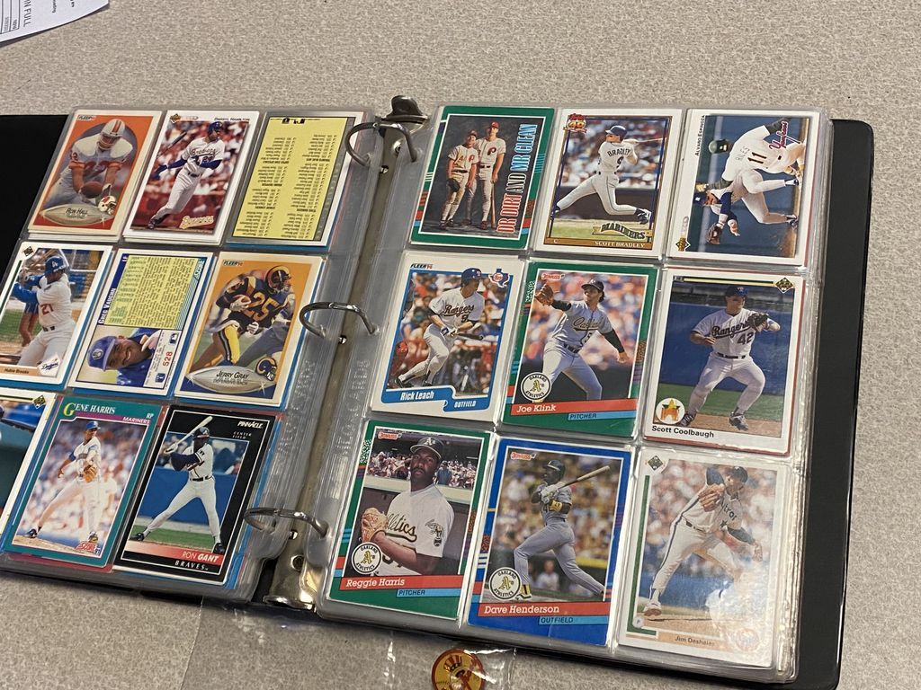 Binder of 1990's Baseball Trading Cards, and Yankees pin. Binder of 1990's Baseball Trading Cards, and Yankees pin.