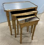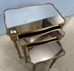 Gold Gilt Nest of Tables, mirrored top, made in China, good condition, tallest is 23"h., 22"w. Location: Left Side 6th Row Gold Gilt Nest of Tables, mirrored top, made in China, good condition, tallest is 23"h., 22"w. Location: Left Side 6th Row