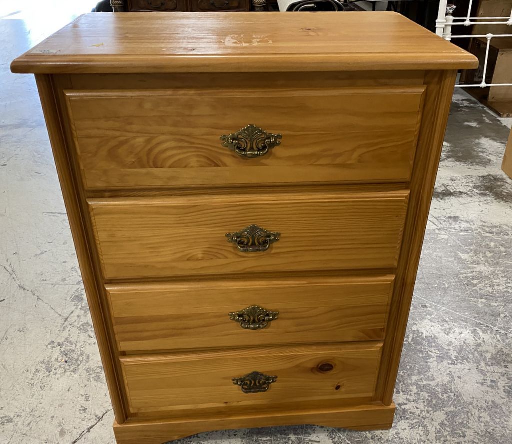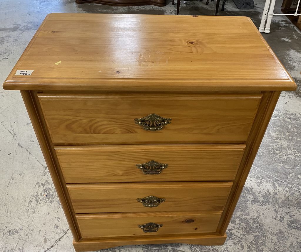 Modern Pine Chest of Drawers, traditional style, four drawers, light wear, 39"h., 30"w., 19"d. Location Right Side 5th Row Modern Pine Chest of Drawers, traditional style, four drawers, light wear, 39"h., 30"w., 19"d. Location Right Side 5th Row