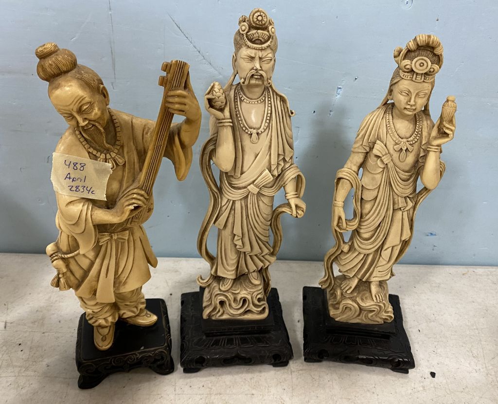 Three Carved Resin Asian Sculptures, wood base, 12"h. Location Front White Shelves, 1st shelf Three Carved Resin Asian Sculptures, wood base, 12"h. Location Front White Shelves, 1st shelf
