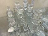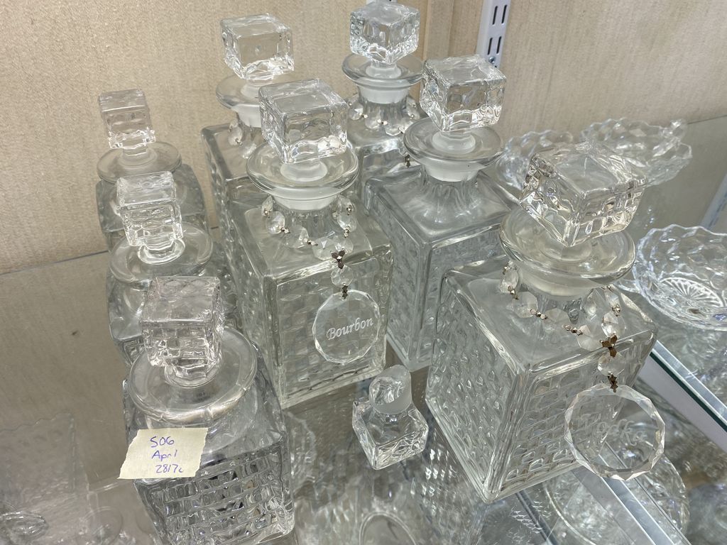 8 Fostoria American Clear Liquor Decanters, tallest are 9 1/2"h. Location Back Tall White Cases 8 Fostoria American Clear Liquor Decanters, tallest are 9 1/2"h. Location Back Tall White Cases