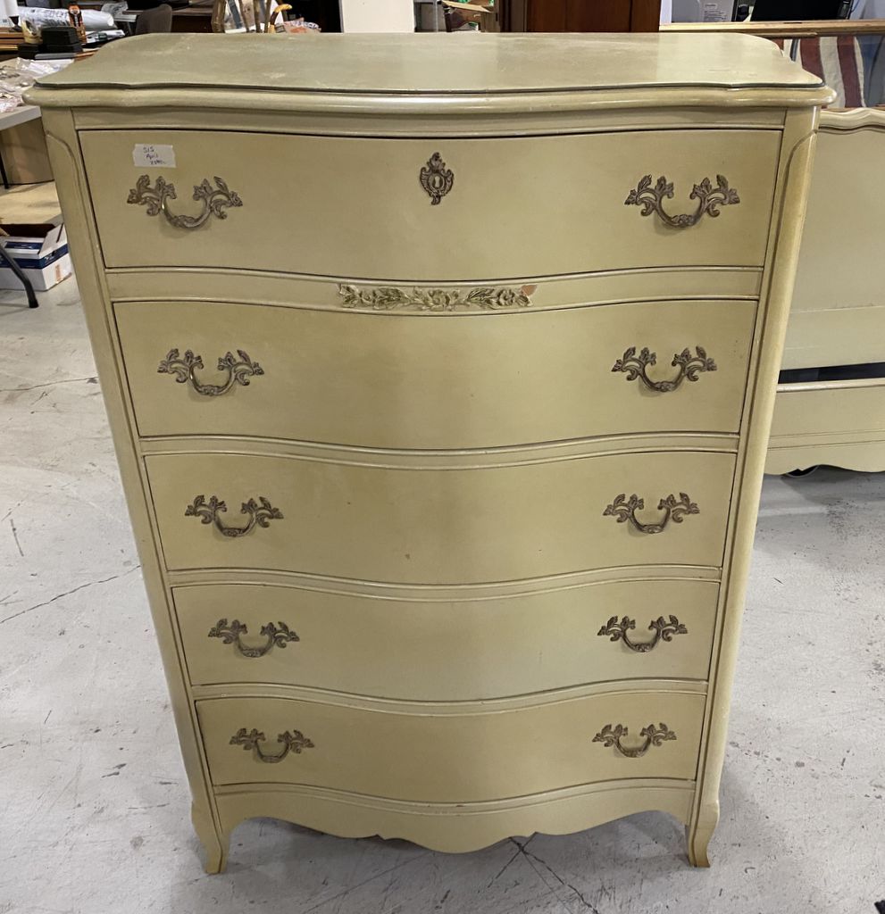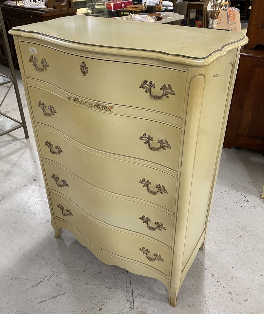 Bassett Furniture Co. French Provincial Chest of Drawers, five drawers, factory painted, 49"h., 34"w. 19"d. Location Right Side 2n Row Bassett Furniture Co. French Provincial Chest of Drawers, five drawers, factory painted, 49"h., 34"w. 19"d. Location Right Side 2n Row