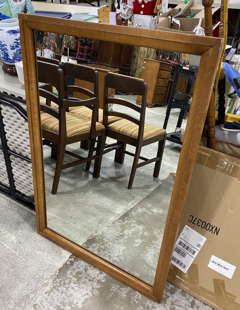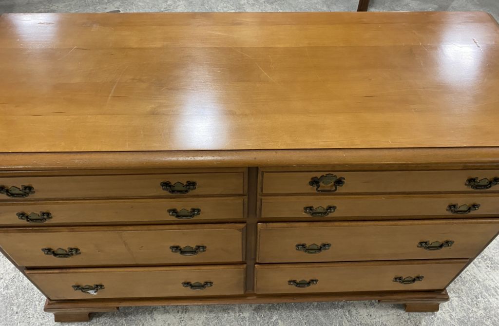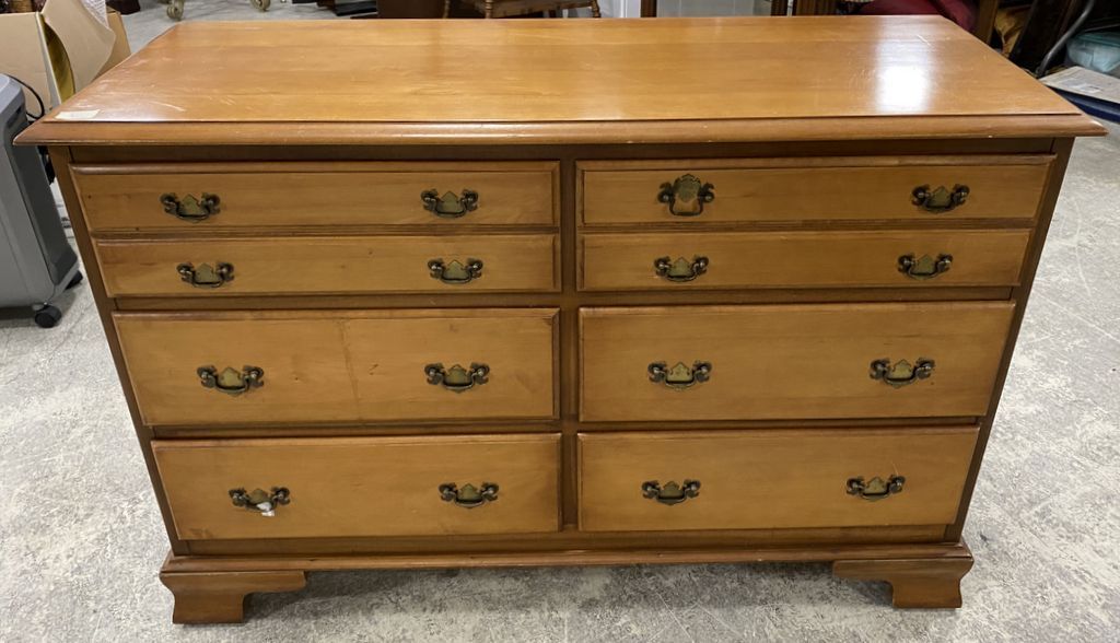 Traditional style maple double dresser, 6 drawers, light wear, Late 20th century, 32"h., 48"w., 18"d. includes mirror. Location Left Side 2nd Row Traditional style maple double dresser, 6 drawers, light wear, Late 20th century, 32"h., 48"w., 18"d. includes mirror. Location Left Side 2nd Row