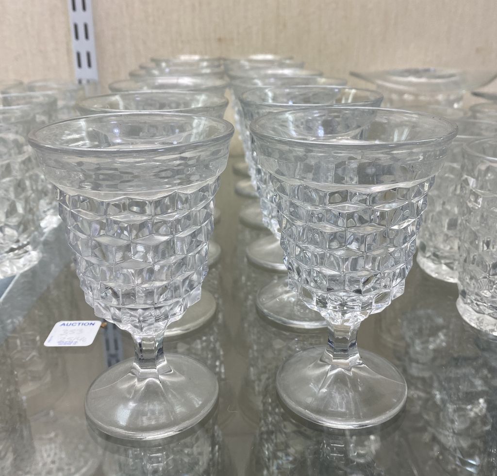 12 Fostoria American Clear Low Water Goblets , 5"h. Location Back Tall White Cases 12 Fostoria American Clear Low Water Goblets , 5"h. Location Back Tall White Cases