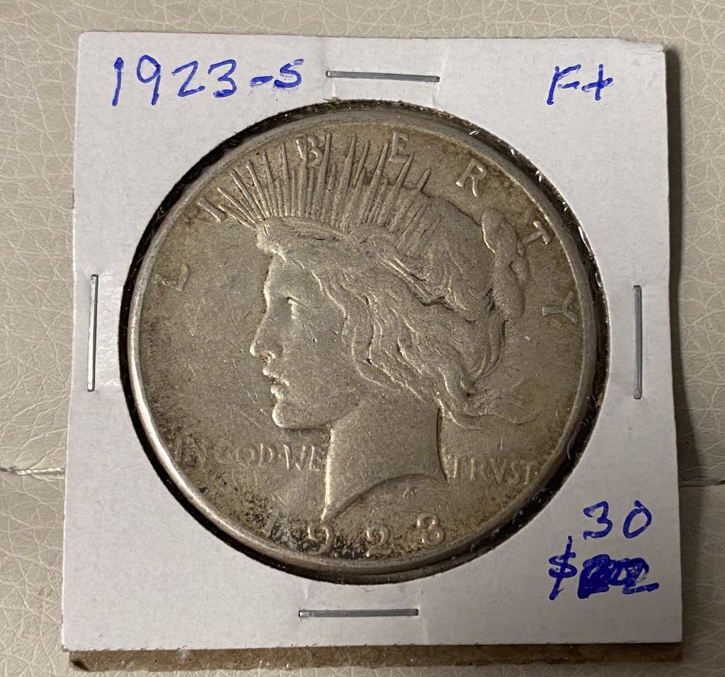 1923-S Peace Dollar, fine plus, paper case, Location: Wood Slant Showcase 1923-S Peace Dollar, fine plus, paper case, Location: Wood Slant Showcase