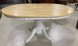 New White Farm Style Pedestal Table, painted base, natural top, good condition, 29"h., 59"long, 41"w. New White Farm Style Pedestal Table, painted base, natural top, good condition, 29"h., 59"long, 41"w.