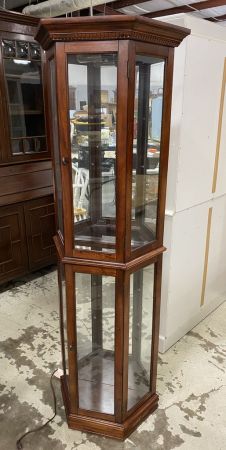 Modern Cherry Curio Cabinet, made in China, mirrored, has glass shelves, 70"h., 25"w., 10"d. Location Right Side 3rd Row Modern Cherry Curio Cabinet, made in China, mirrored, has glass shelves, 70"h., 25"w., 10"d. Location Right Side 3rd Row