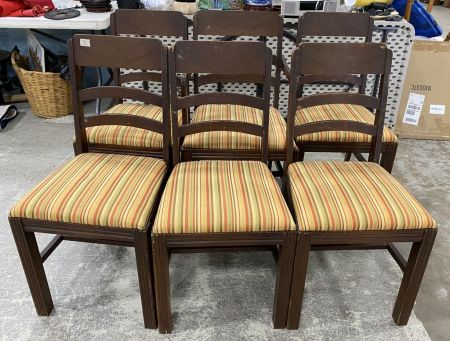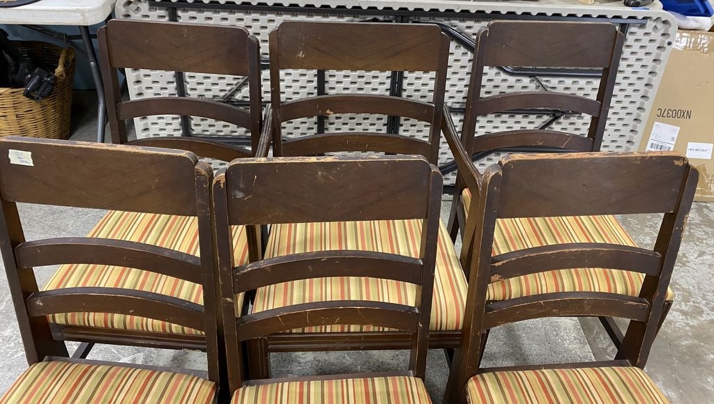 6 Vintage Dining Chairs, striped cushions, has wear, one arm, five sides. Location Left Side 1st Rows 6 Vintage Dining Chairs, striped cushions, has wear, one arm, five sides. Location Left Side 1st Rows