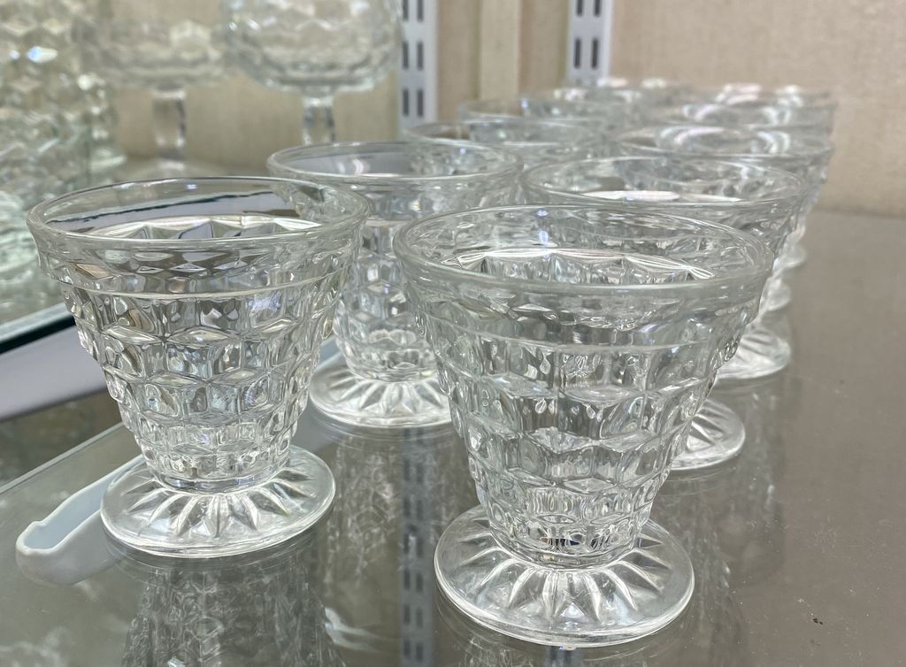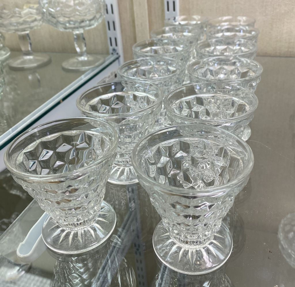 6 Fostoria American Clear Oyster Cocktail Glasses, 3"h. Location Back Tall White Cases 6 Fostoria American Clear Oyster Cocktail Glasses, 3"h. Location Back Tall White Cases
