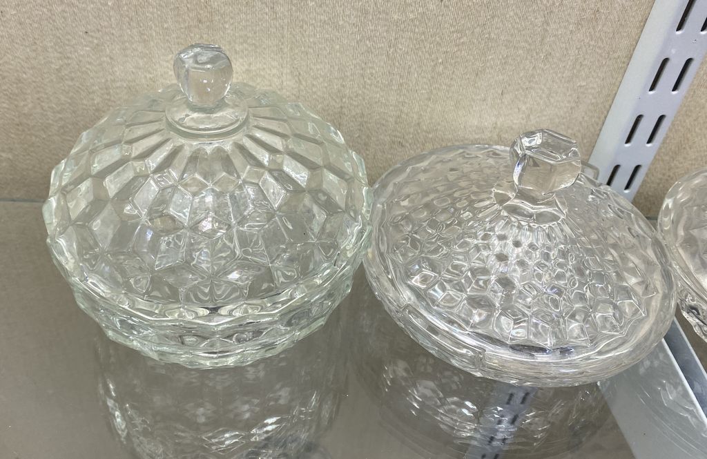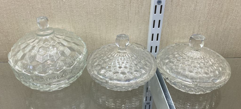 3 Fostoria American Clear Covered Bowls, Location Back Tall White Cases 3 Fostoria American Clear Covered Bowls, Location Back Tall White Cases
