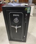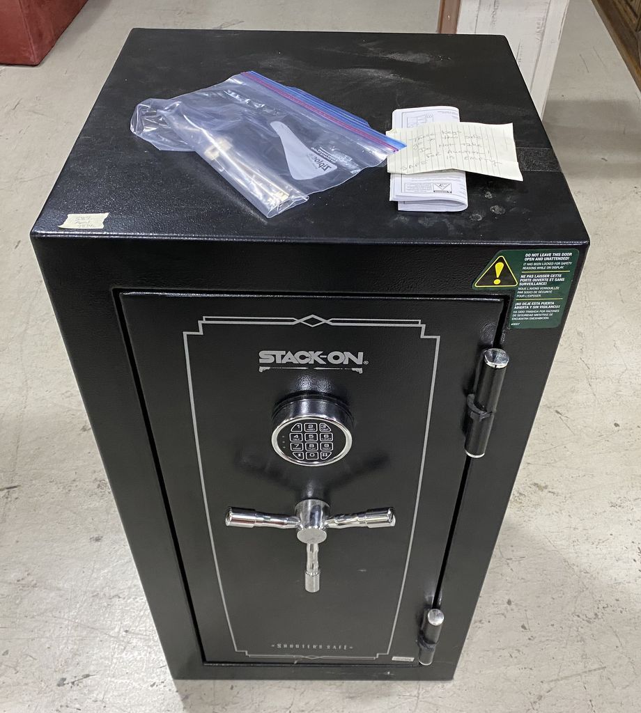 Stack on Shooters Safe, has key, key pad needs resetting, has master key, 40"h., 21"w., 20"d. Location: Left Side 3rd Row Stack on Shooters Safe, has key, key pad needs resetting, has master key, 40"h., 21"w., 20"d. Location: Left Side 3rd Row