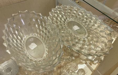 Fostoria American Clear Bowl and Platter 14", Location Back Tall White Cases. Fostoria American Clear Bowl and Platter 14", Location Back Tall White Cases.