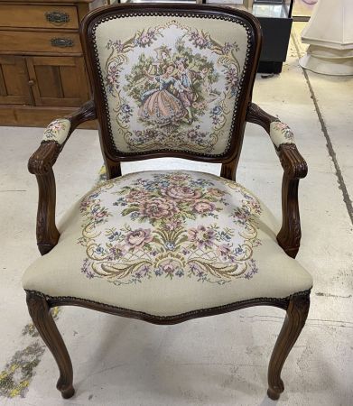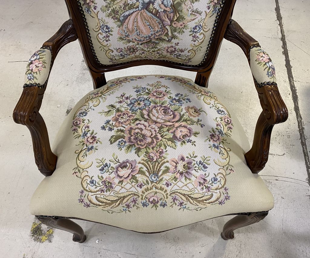 Reproduction Cherry French Arm Accent Chair, needlepoint style upholstery, good condition, Location: Left Side 7th Row Reproduction Cherry French Arm Accent Chair, needlepoint style upholstery, good condition, Location: Left Side 7th Row