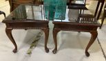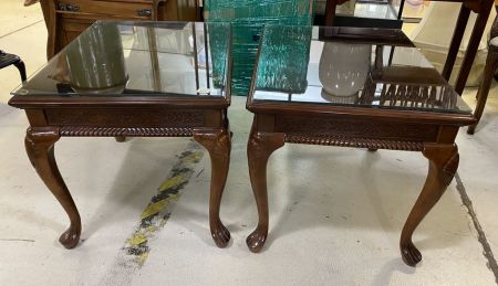 Pair of Queen Anne Cherry Side Tables, glass tops, good condition, 21"h., 22"w., 27"d. Location: Left Side 5th Row Pair of Queen Anne Cherry Side Tables, glass tops, good condition, 21"h., 22"w., 27"d. Location: Left Side 5th Row