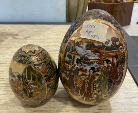 Pair of Small Satsuma Style Eggs, hand painted, tallest is 8"h. Pair of Small Satsuma Style Eggs, hand painted, tallest is 8"h.