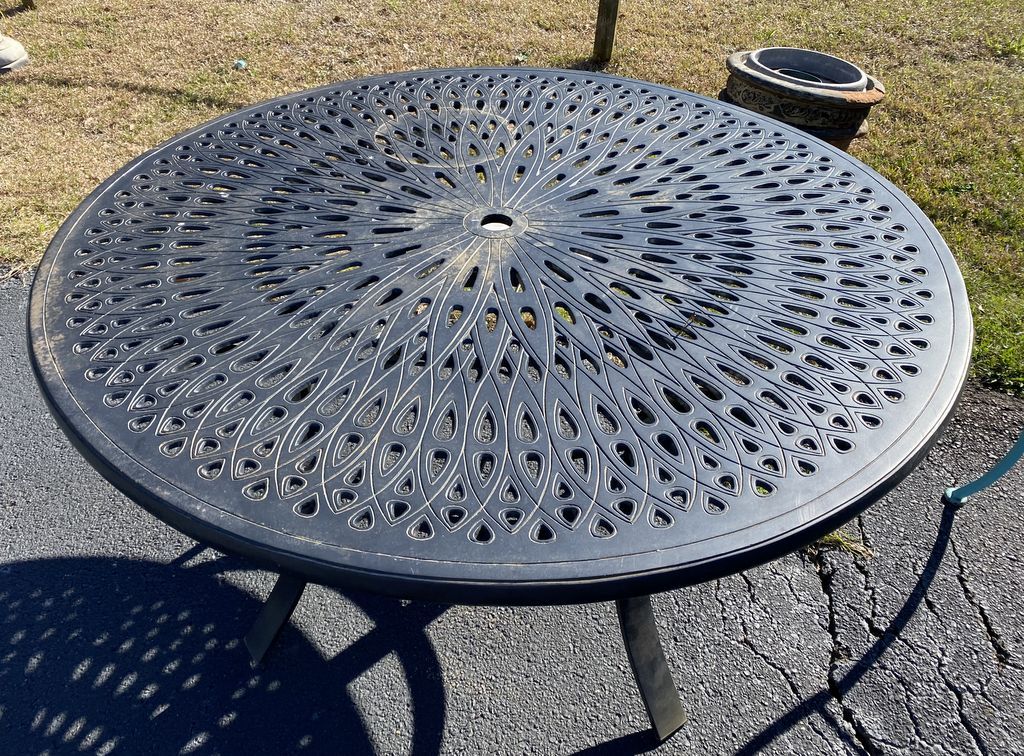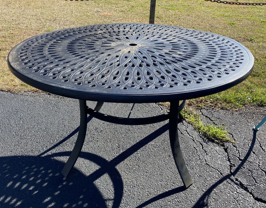 Round Aluminum Patio Table, includes red umbrella and umbrella base. Light wear. Round Aluminum Patio Table, includes red umbrella and umbrella base. Light wear.