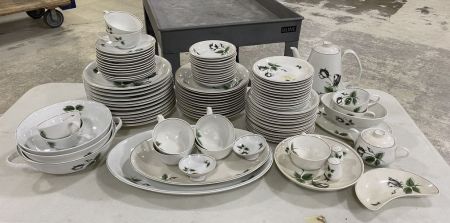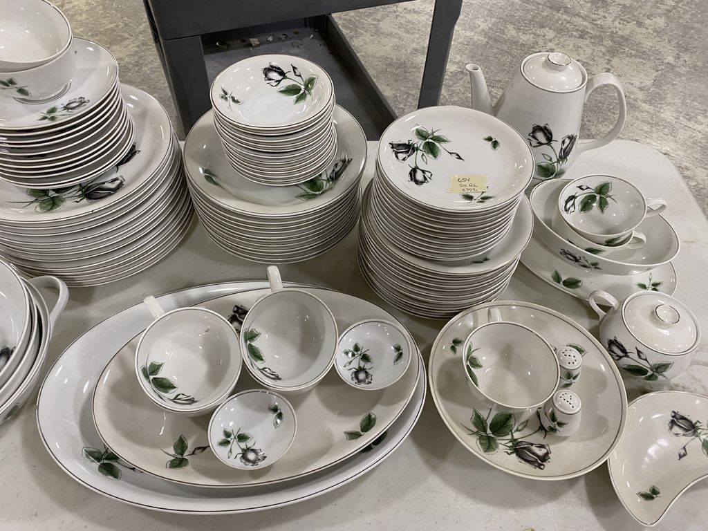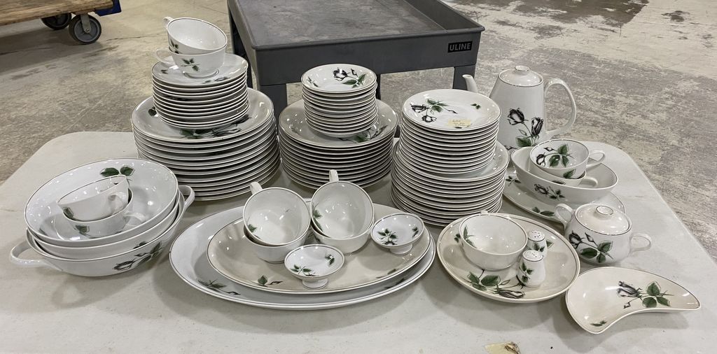 Rosenthal Bavaria China Set, 12 dinner plates, 12 soup bowls, 12 saucers, 12 cups, 12 salad plates, two serving bowls, platters, 12 berry bowls, gravy, pitcher, salt & pepper, 12 dessert plates. Back Metal Shelves - Front Side. Rosenthal Bavaria China Set, 12 dinner plates, 12 soup bowls, 12 saucers, 12 cups, 12 salad plates, two serving bowls, platters, 12 berry bowls, gravy, pitcher, salt & pepper, 12 dessert plates. Back Metal Shelves - Front Side.