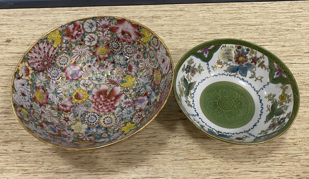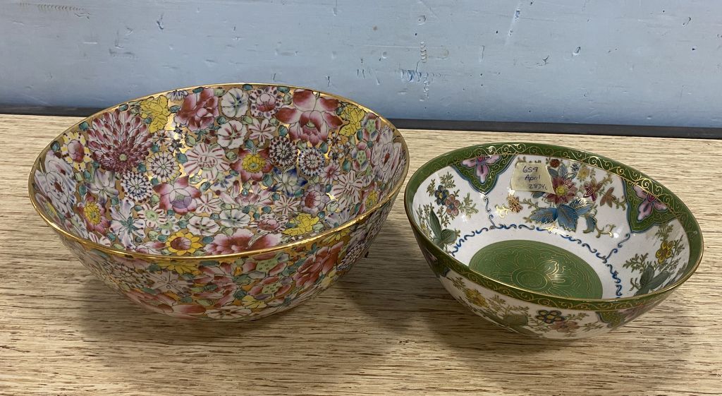 Two Japanese Porcelain Bowls, floral designs, largest is 4 1/2"h., 10"dia. Location Front White Shelves, 3rd shelf Two Japanese Porcelain Bowls, floral designs, largest is 4 1/2"h., 10"dia. Location Front White Shelves, 3rd shelf