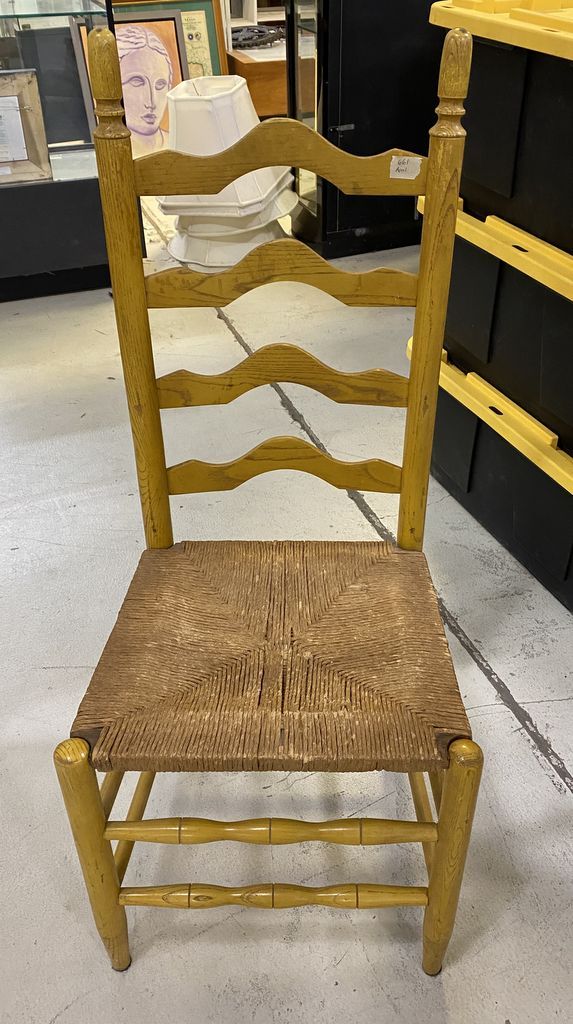 Oak Slat High Back Chair, woven seat, has light wear. Location: Left Side 7th Row Oak Slat High Back Chair, woven seat, has light wear. Location: Left Side 7th Row