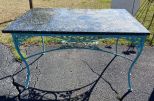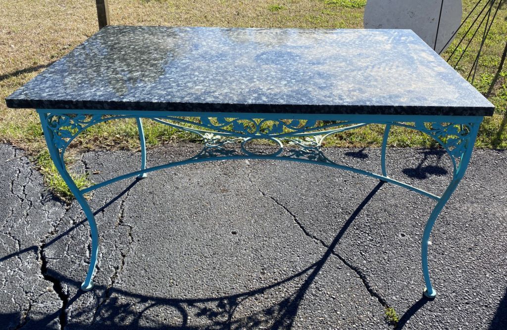 Painted Turquoise Iron Patio Table with granite top, heavy top. Painted Turquoise Iron Patio Table with granite top, heavy top.