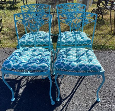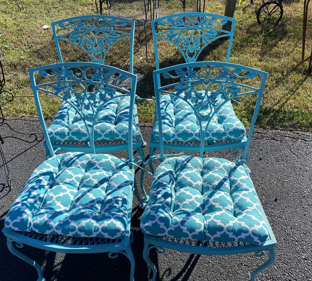 Four Painted Turquoise Iron Patio Chairs, with cushions, matches lot 655. Four Painted Turquoise Iron Patio Chairs, with cushions, matches lot 655.