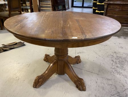 Oak Pedestal Dining Table, paw footed, two leaves, has finish wear, 30"h., 48"dia. Location Right Side 5th Row Oak Pedestal Dining Table, paw footed, two leaves, has finish wear, 30"h., 48"dia. Location Right Side 5th Row