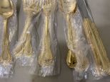 Oneida Silversmiths Gold Color Flatware, 4 knives, 4 salad forks, 4 dinner forks, 4 soup spoons, 4 teaspoons, tongs, and serving fork. Location Showcases behind Screen Oneida Silversmiths Gold Color Flatware, 4 knives, 4 salad forks, 4 dinner forks, 4 soup spoons, 4 teaspoons, tongs, and serving fork. Location Showcases behind Screen