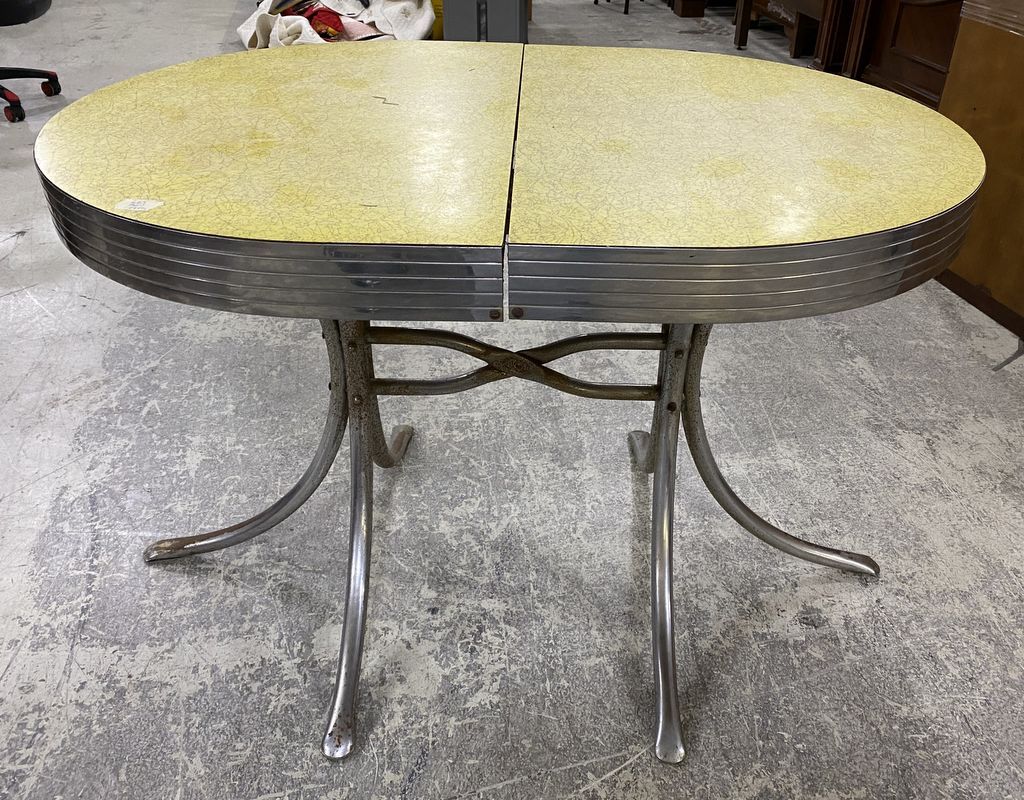 Mid Century Ice Cream Table, yellow and chrome, some rust, 30"h., 44"w. Location Front of Screen Mid Century Ice Cream Table, yellow and chrome, some rust, 30"h., 44"w. Location Front of Screen