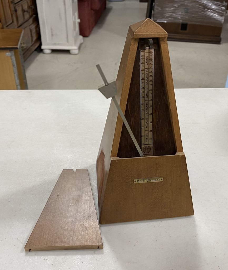 Seth Thomas Metronome, works, 9"h. Location: Black Silver Metal Shelves Seth Thomas Metronome, works, 9"h. Location: Black Silver Metal Shelves
