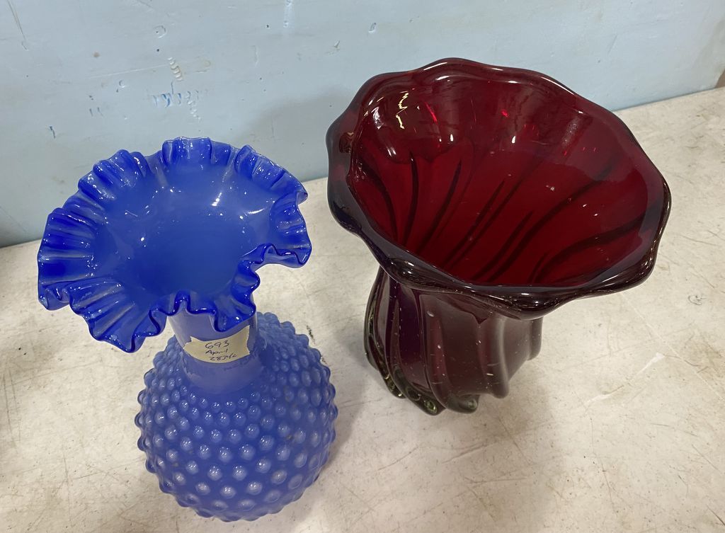 693 Fenton Style Blue Vase and Heavy Red Glass Vase