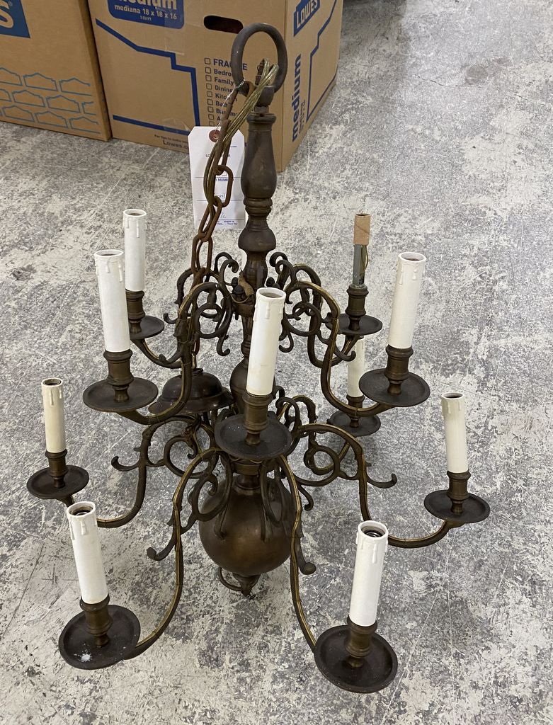 Brass Williamsburg Chandelier, has tarnish, 30"h. Location: Back Wall Brass Williamsburg Chandelier, has tarnish, 30"h. Location: Back Wall