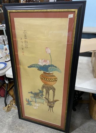Asian Style Painted Vase on Paper, framed, 59"h., 29"w. Location Back of Center Asian Style Painted Vase on Paper, framed, 59"h., 29"w. Location Back of Center