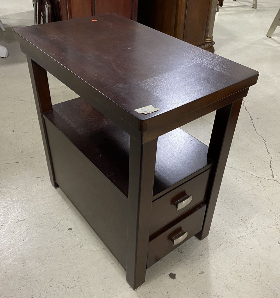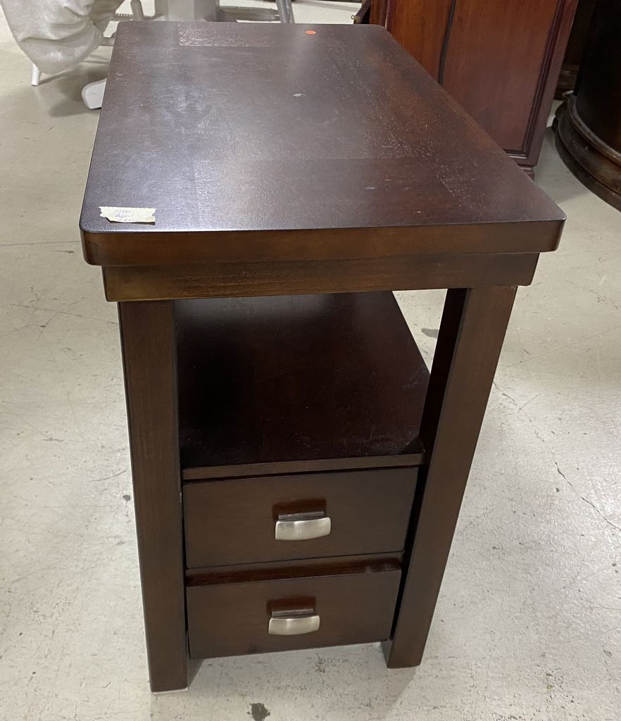 Cherry Narrow modern lamp table, two drawers, 24"h., 14"w., 24"d. Location Right Side 5th Row Cherry Narrow modern lamp table, two drawers, 24"h., 14"w., 24"d. Location Right Side 5th Row