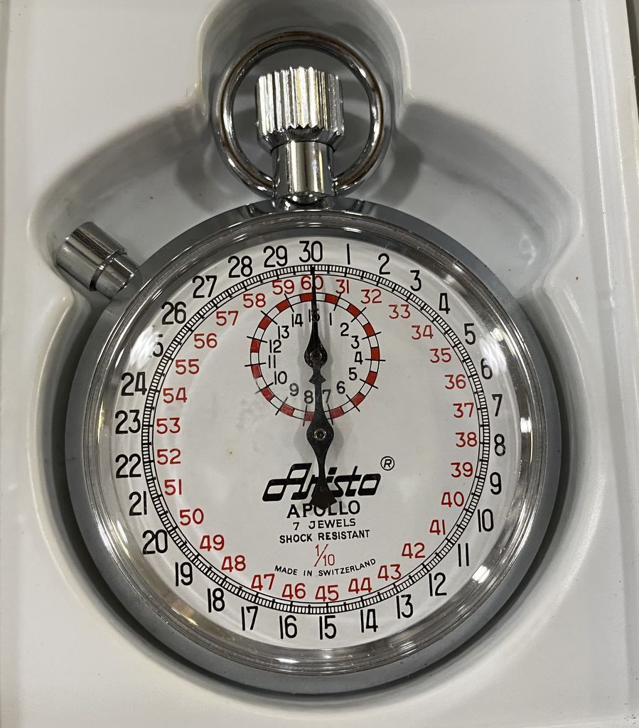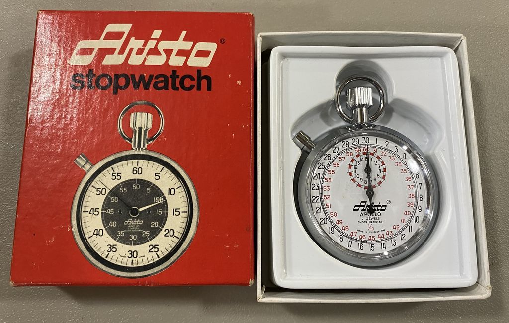 Aristo Apollo 7 Jewel Stopwatch, vintage, N.O.S., 14 1/2, original box. Location Case by Auction Stand Aristo Apollo 7 Jewel Stopwatch, vintage, N.O.S., 14 1/2, original box. Location Case by Auction Stand
