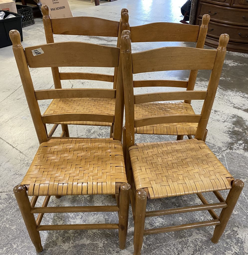Four Primitive Style Maple Slat Back Chairs, woven seats, good condition. Location Left Side 2nd Row Four Primitive Style Maple Slat Back Chairs, woven seats, good condition. Location Left Side 2nd Row