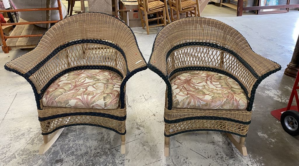 Pair of Resin Wicker Patio Chairs, good condition, includes cushions. Pair of Resin Wicker Patio Chairs, good condition, includes cushions.