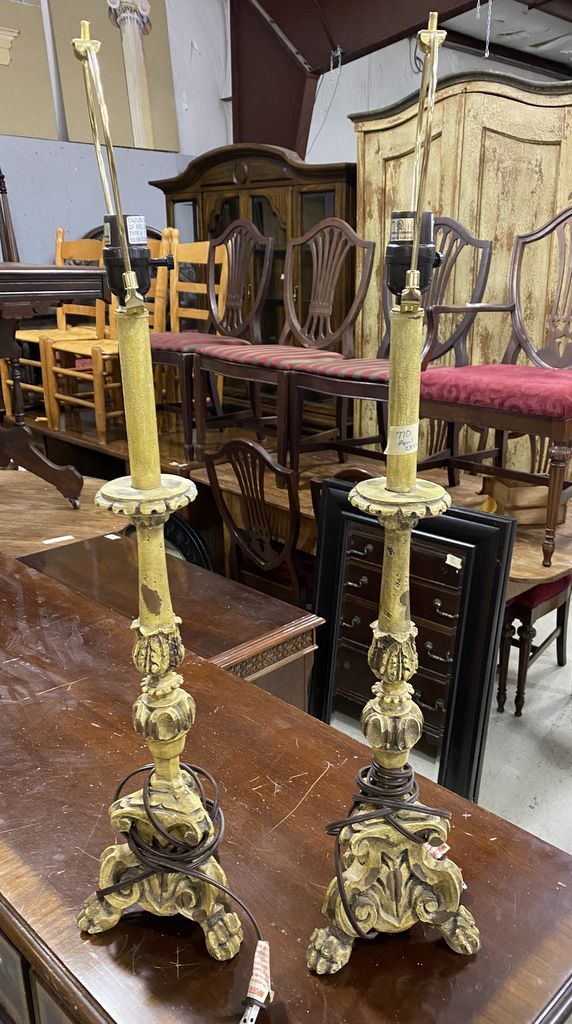 770 Pair of Vintage Carved Wood Candle Stick Lamps