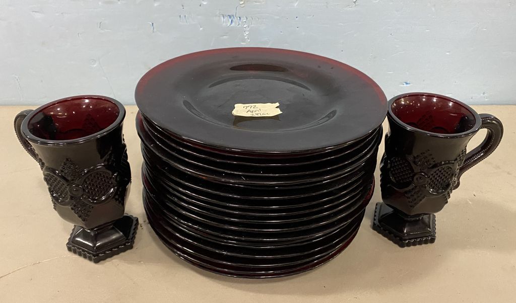 17 Red Glass Salad Plates and Two Mugs. Location: Back Metal Cases/Backside 17 Red Glass Salad Plates and Two Mugs. Location: Back Metal Cases/Backside