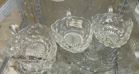 3 Fostoria American Clear Nappy, Location Back Tall White Cases. 3 Fostoria American Clear Nappy, Location Back Tall White Cases.