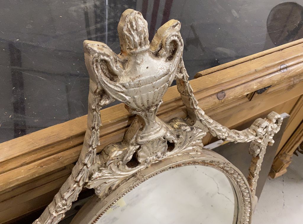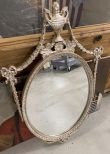 French Louis XVI Style Wall Mirror, modern reproduction, 41"h., 23"w., silver color, thin wood. French Louis XVI Style Wall Mirror, modern reproduction, 41"h., 23"w., silver color, thin wood.