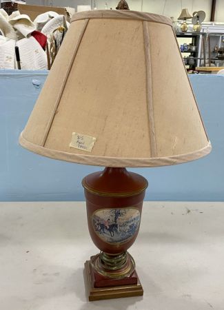 English Hunt Scene Vase Lamp, metal, with shade, 24"h. Location Showcases behind Screen English Hunt Scene Vase Lamp, metal, with shade, 24"h. Location Showcases behind Screen