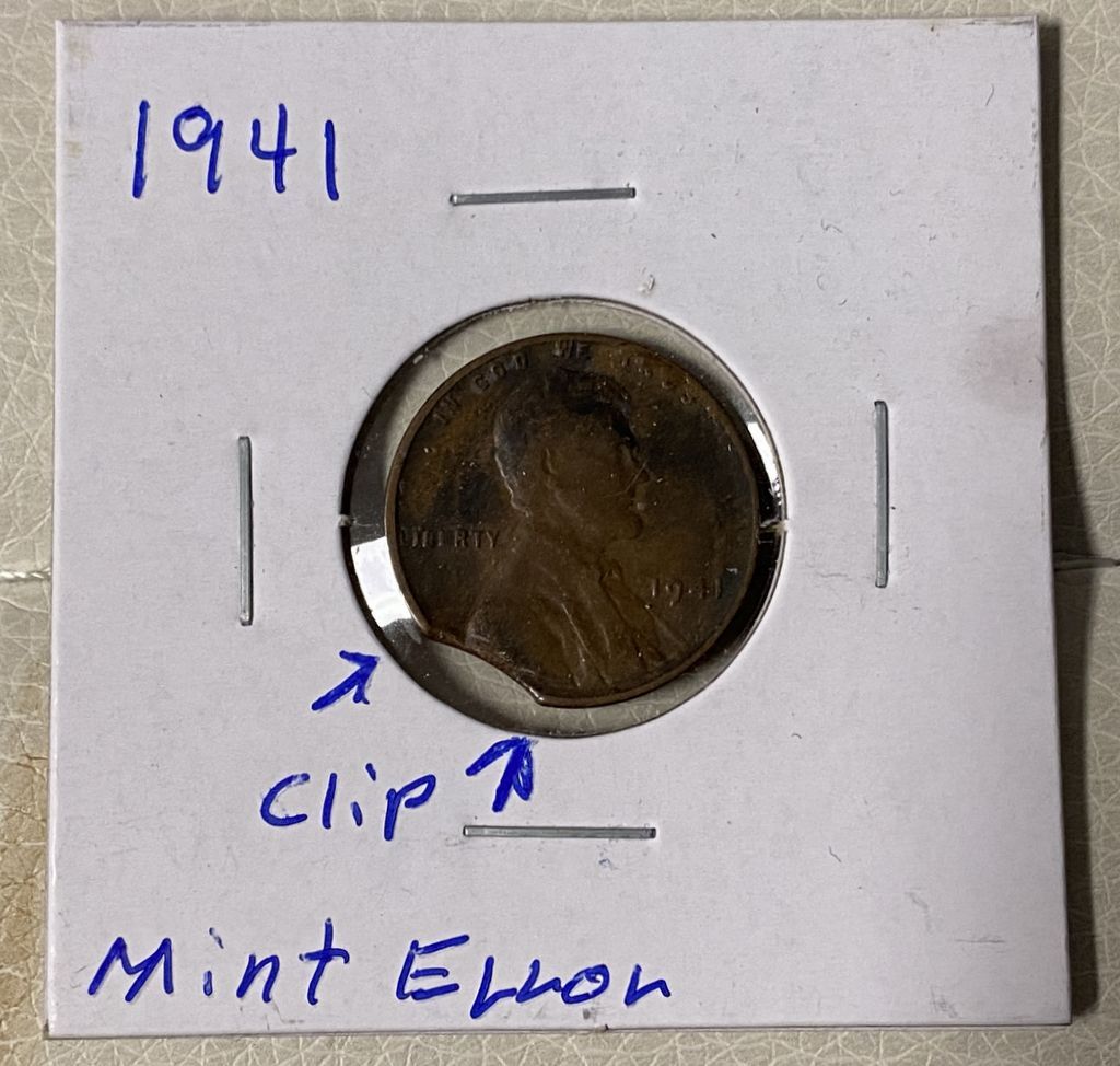 1941 Lincoln Cent, Mint error, clip, paper case, Location: Wood Slant Showcase 1941 Lincoln Cent, Mint error, clip, paper case, Location: Wood Slant Showcase