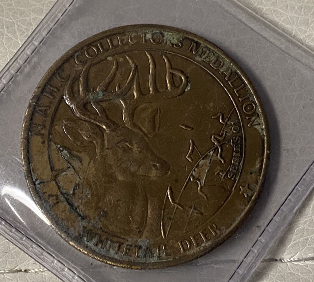 N.A.H.C. Collectors Medallion Series 1 Whitetail Bronze, has tarnish. Location: Wood Slant Showcase N.A.H.C. Collectors Medallion Series 1 Whitetail Bronze, has tarnish. Location: Wood Slant Showcase