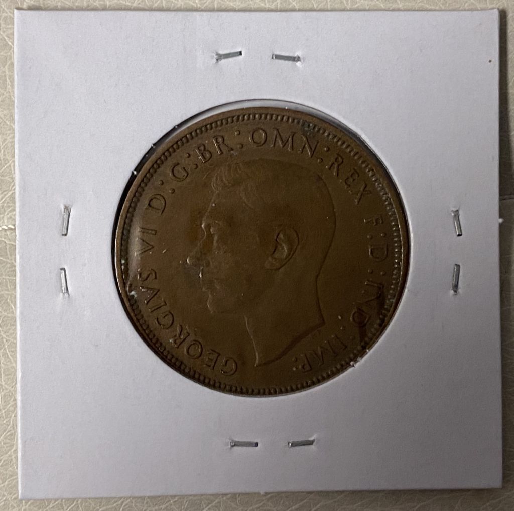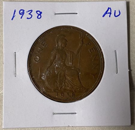 1938 British Large Penny, King George V, Almost Uncirculated Condition. Location: Wood Slant Showcase 1938 British Large Penny, King George V, Almost Uncirculated Condition. Location: Wood Slant Showcase