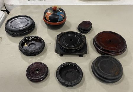 Vintage Paper Mache Hand Painted Japanese Black Lacquer Wooden Box and Group of Wooden Bases and Stands, Location Front White Shelves, 3rd shelf Vintage Paper Mache Hand Painted Japanese Black Lacquer Wooden Box and Group of Wooden Bases and Stands, Location Front White Shelves, 3rd shelf