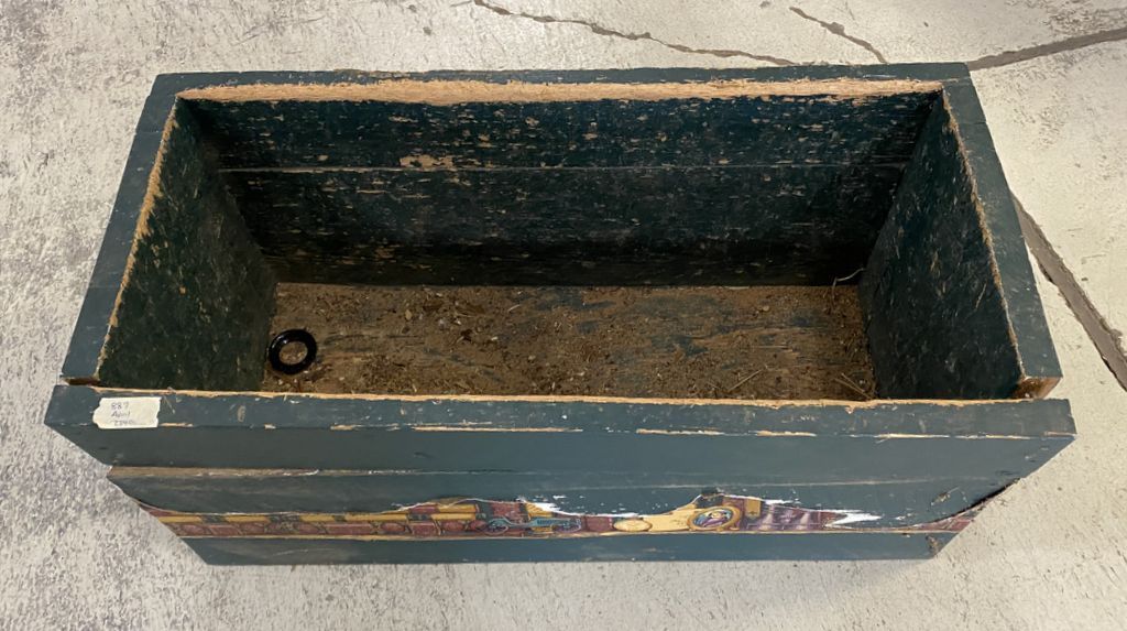 Old Wood Fire Wood Box, aged, has wear, 14"h., 30"w. Location Front of Screen Old Wood Fire Wood Box, aged, has wear, 14"h., 30"w. Location Front of Screen