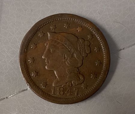 1847 Large Cent, good condition. Location: Wood Slant Showcase 1847 Large Cent, good condition. Location: Wood Slant Showcase