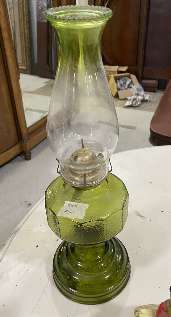 Green Glass Oil Lamp, hurricane shade, 18"h. Location: Back White Cases Green Glass Oil Lamp, hurricane shade, 18"h. Location: Back White Cases