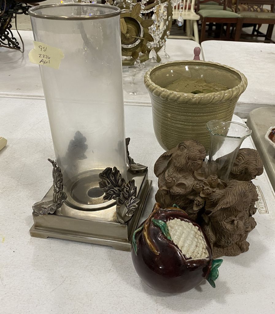 Glass Shade candle holder with metal base, rabbit flute flower vase, ceramic flower pot. Location: Back Metal Cases/Backside Glass Shade candle holder with metal base, rabbit flute flower vase, ceramic flower pot. Location: Back Metal Cases/Backside