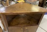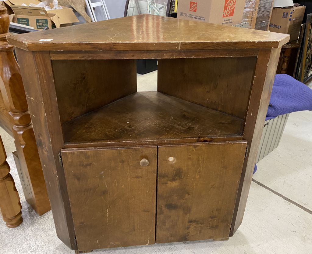 Oak TV Corner Cabinet, missing one pull, has scratches, 44"h., 42"w., 24"d. Location: Left Side 6th Row Oak TV Corner Cabinet, missing one pull, has scratches, 44"h., 42"w., 24"d. Location: Left Side 6th Row